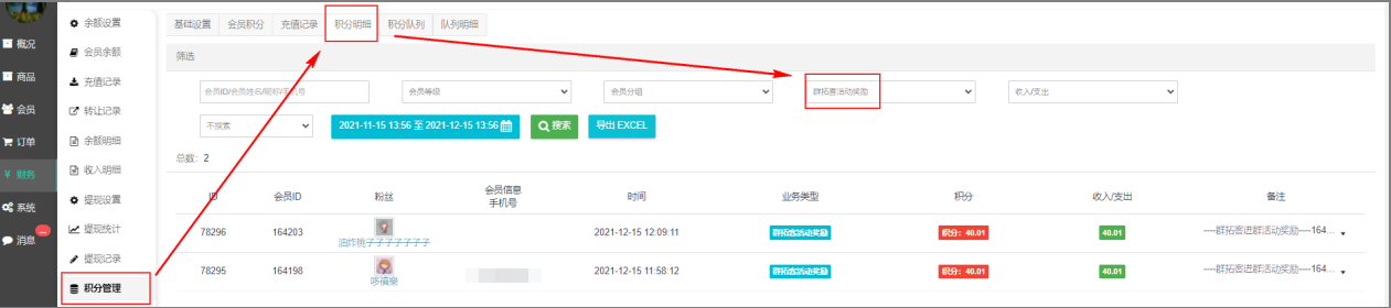 财务—积分管理—积分明细—业务类型:增加“群拓客活动奖励”