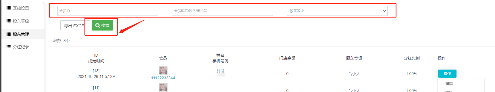 ⑤可通过会员id/昵称/姓名/手机号、股东等级进行筛选