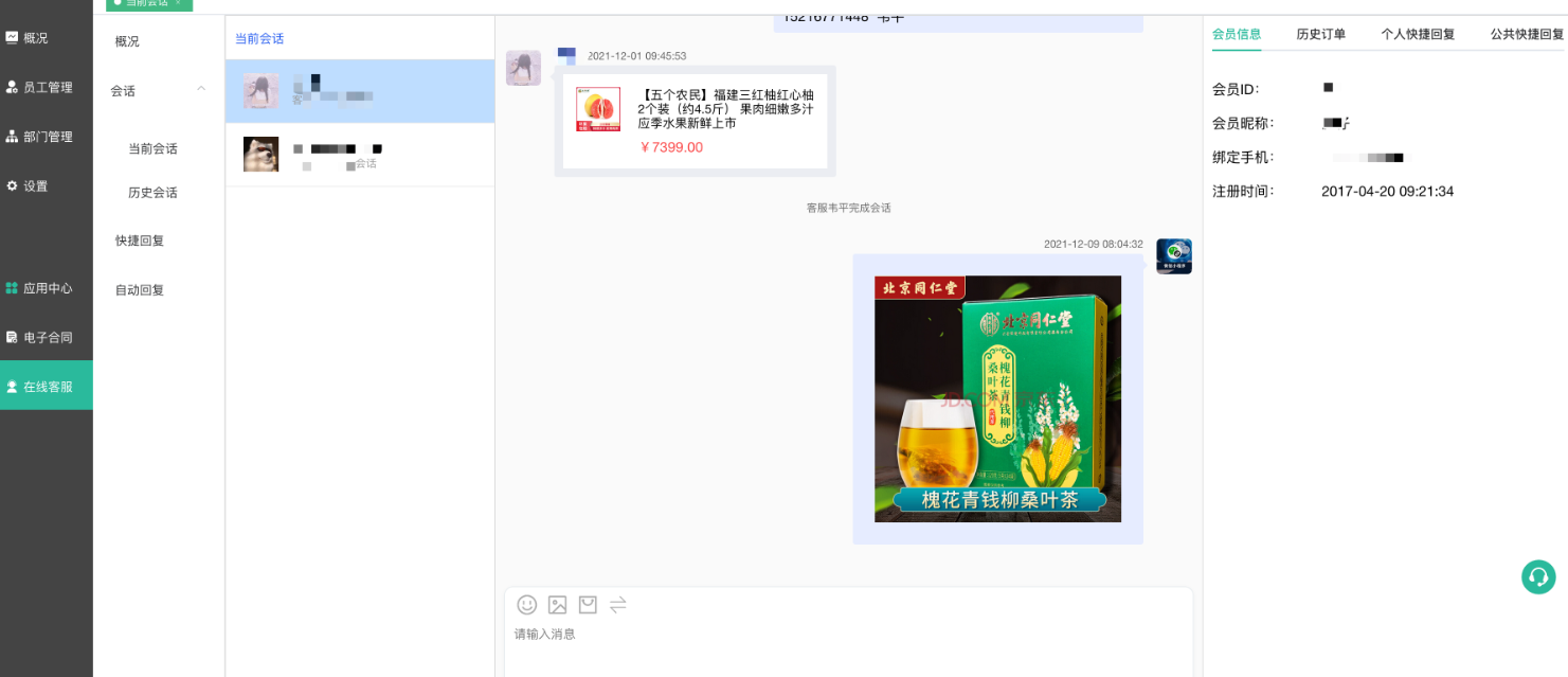 2区域:会话内容,显示客服和会员之间聊天的内容,类似QQ\微信等聊天界面;