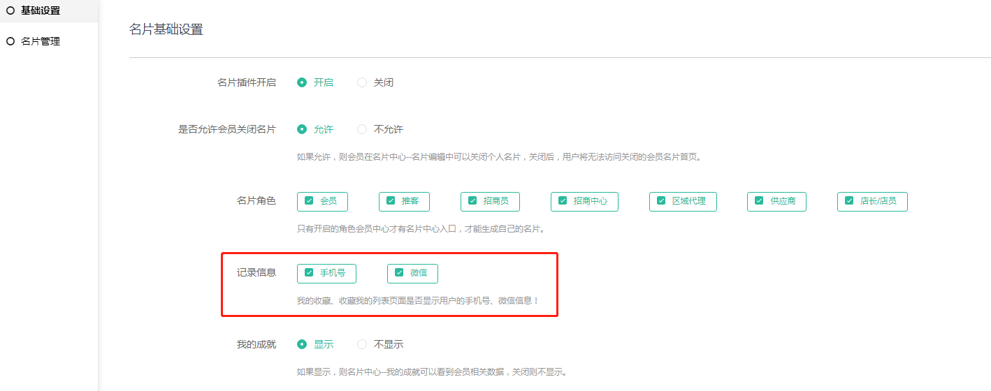 4,记录信息:我的收藏和收藏我的列表页面是否显示会员用户在名片编辑处填写的手机号和微信,勾选并且会员有填写才会显示【收藏我的在前端数据统计处】