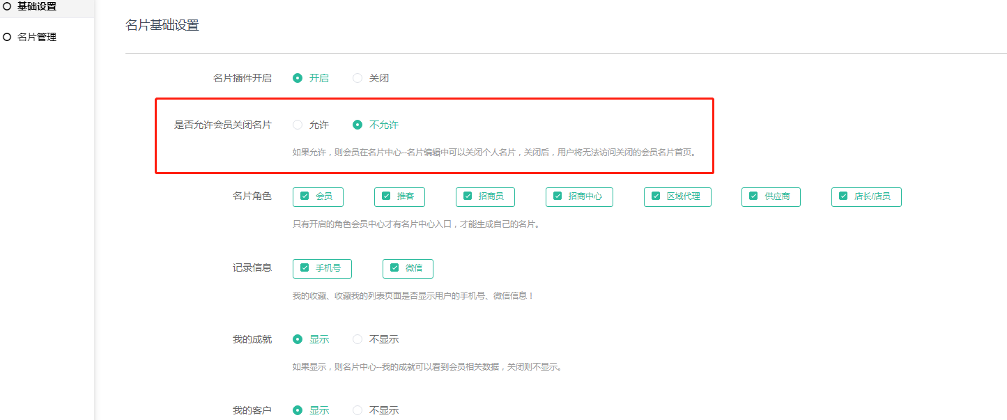 2,是否允许会员关闭名片: